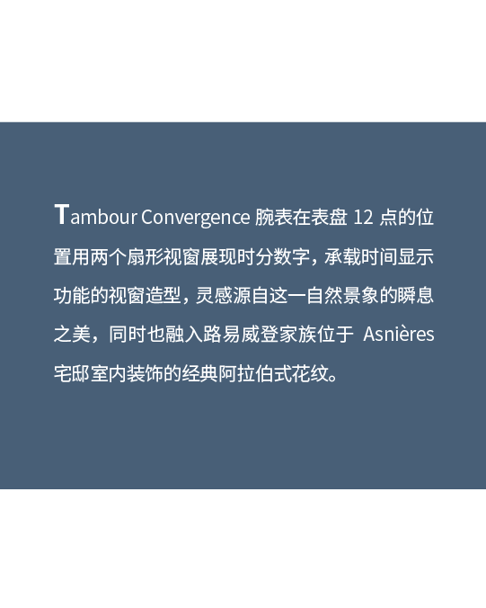 另一枚首次在 Tambour 系列中亮相的 Convergence 腕表,展现着一种独特的复古风韵,让人一下就回想起上世纪上半叶流行的视窗腕表风潮。它采用了一种非常传统的视窗显示方式,强调了时间的精准与稍纵即逝,犹如金色晨光透过云隙洒下,瞬间捕捉时间流转的灵动之美。