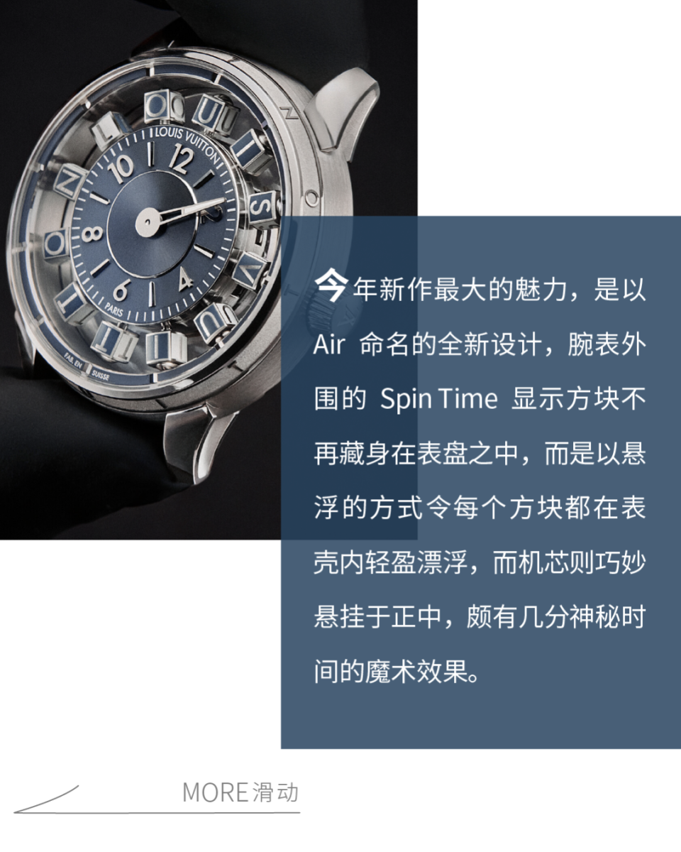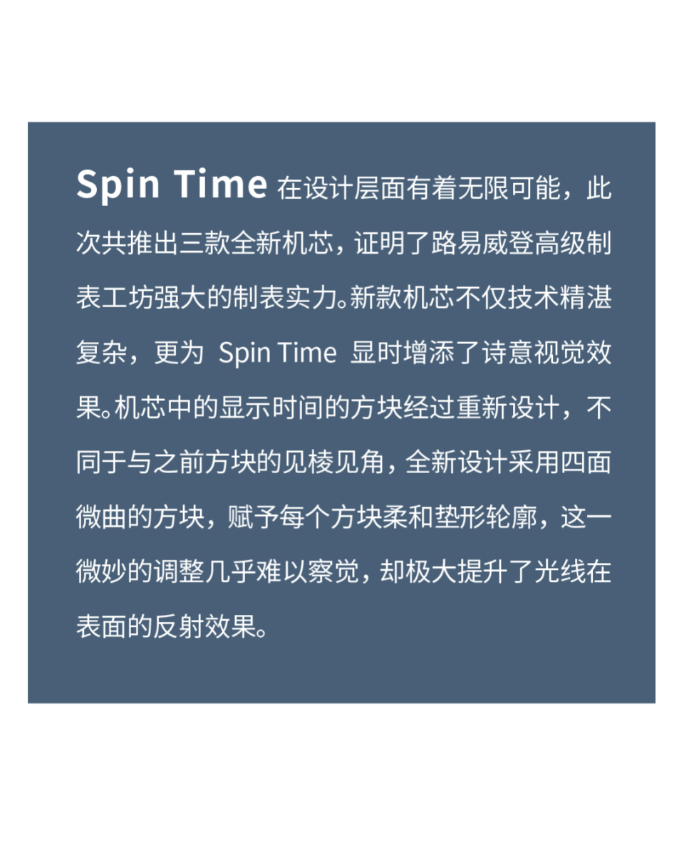 《Chronos 手表》杂志主编、瑞士高级制表基金会(FHH)文化理事会成员丁之向点评:“路易威登这一次在 Spin Time 上非常用心,这是第一次在 Spin Time 上使用自产机芯,我觉得最了不起的一点,就是把尺寸变小了,从技术层面看这很不容易。”