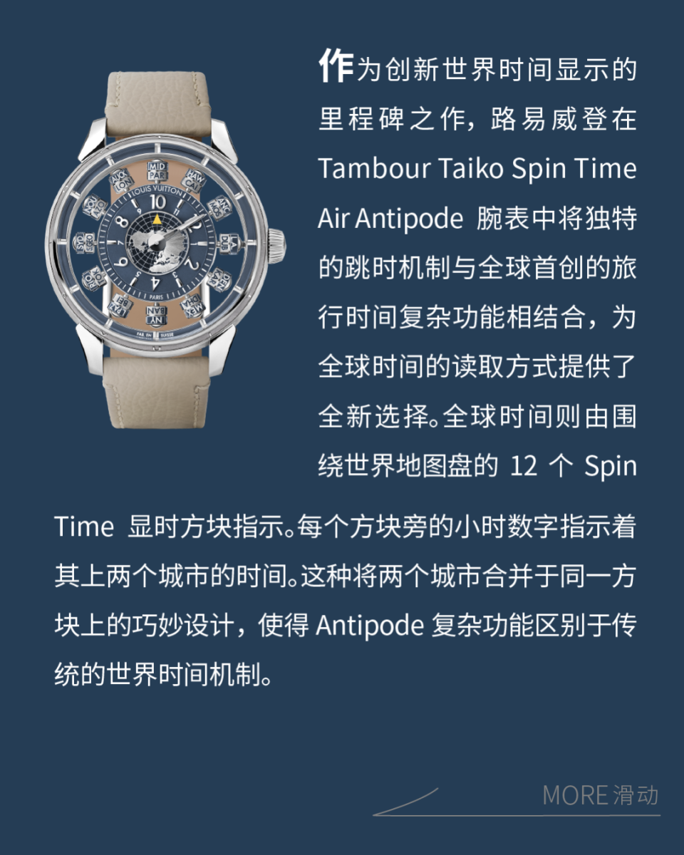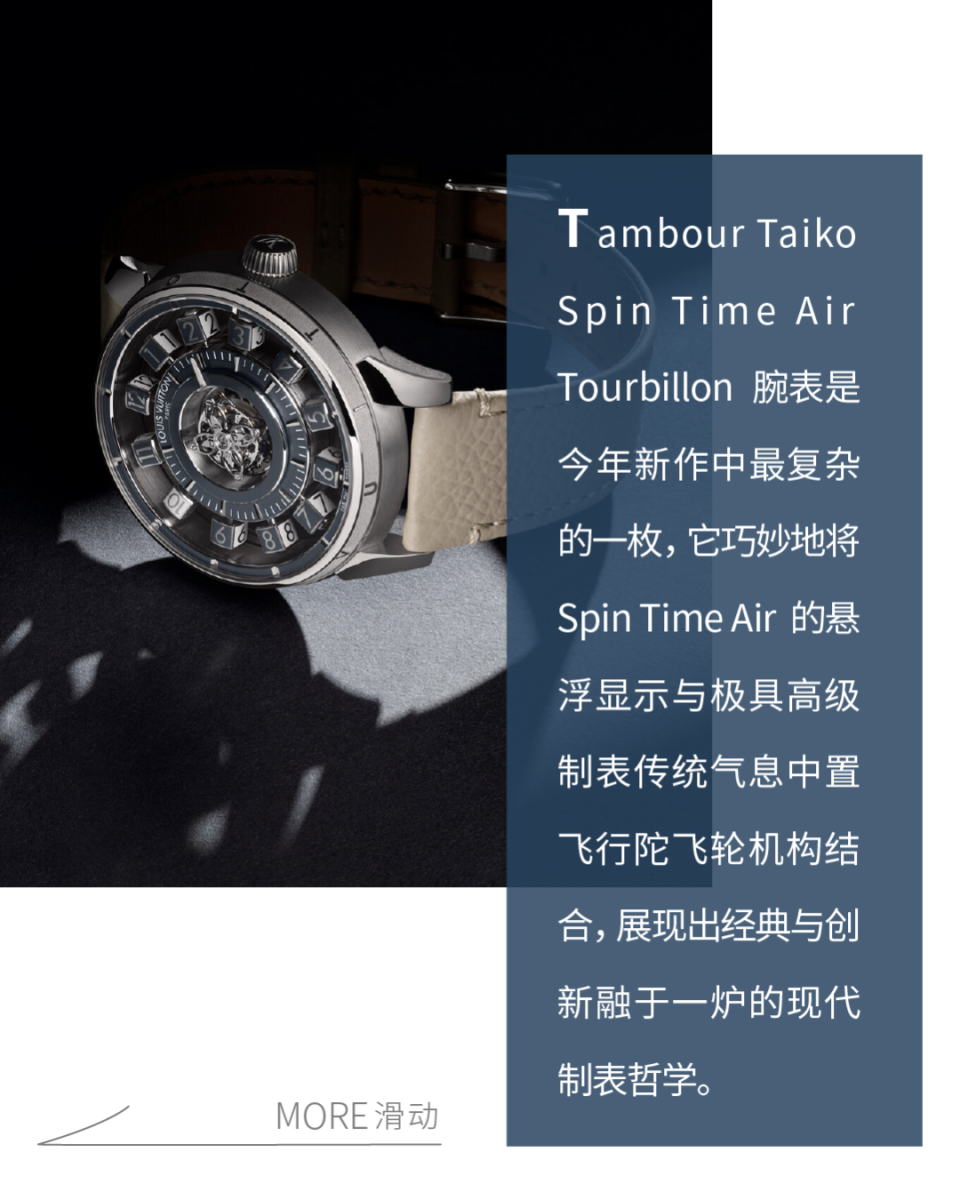 16 年后,Tambour Spin Time 再度结出了新的硕果。全新 Tambour Taiko Spin Time 系列仍然以专利认证的三维跳跃显时方块为核心,通过对经典设计“Spin Time”的重新演绎,展现了路易威登在设计领域的独辟蹊径,以及与传统制表品牌在设计方面的独特视角。